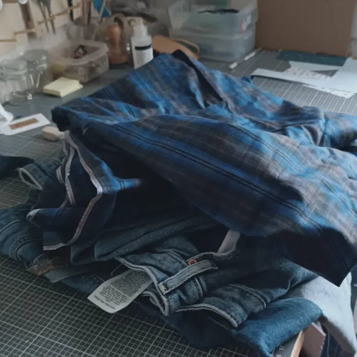 Chaque création commence par la matière : un tissu oublié, un vêtement usé, un échantillon délaissé. Je le découpe, le repasse, le mesure, le recoupe, l’épingle, puis le couds avec soin.